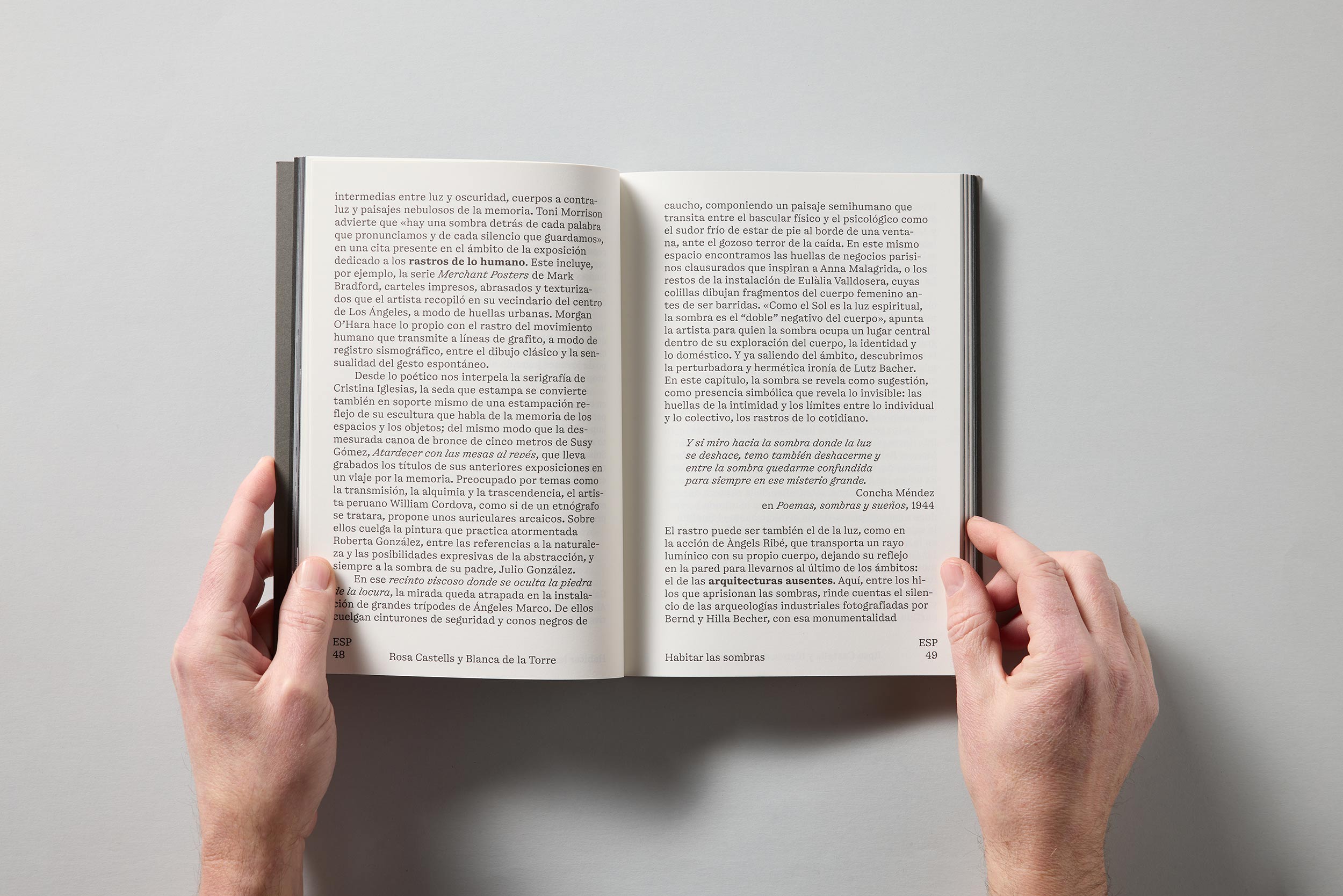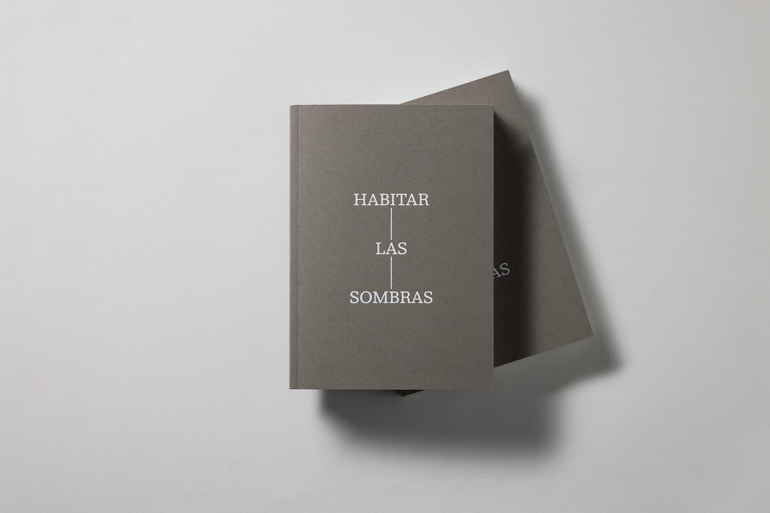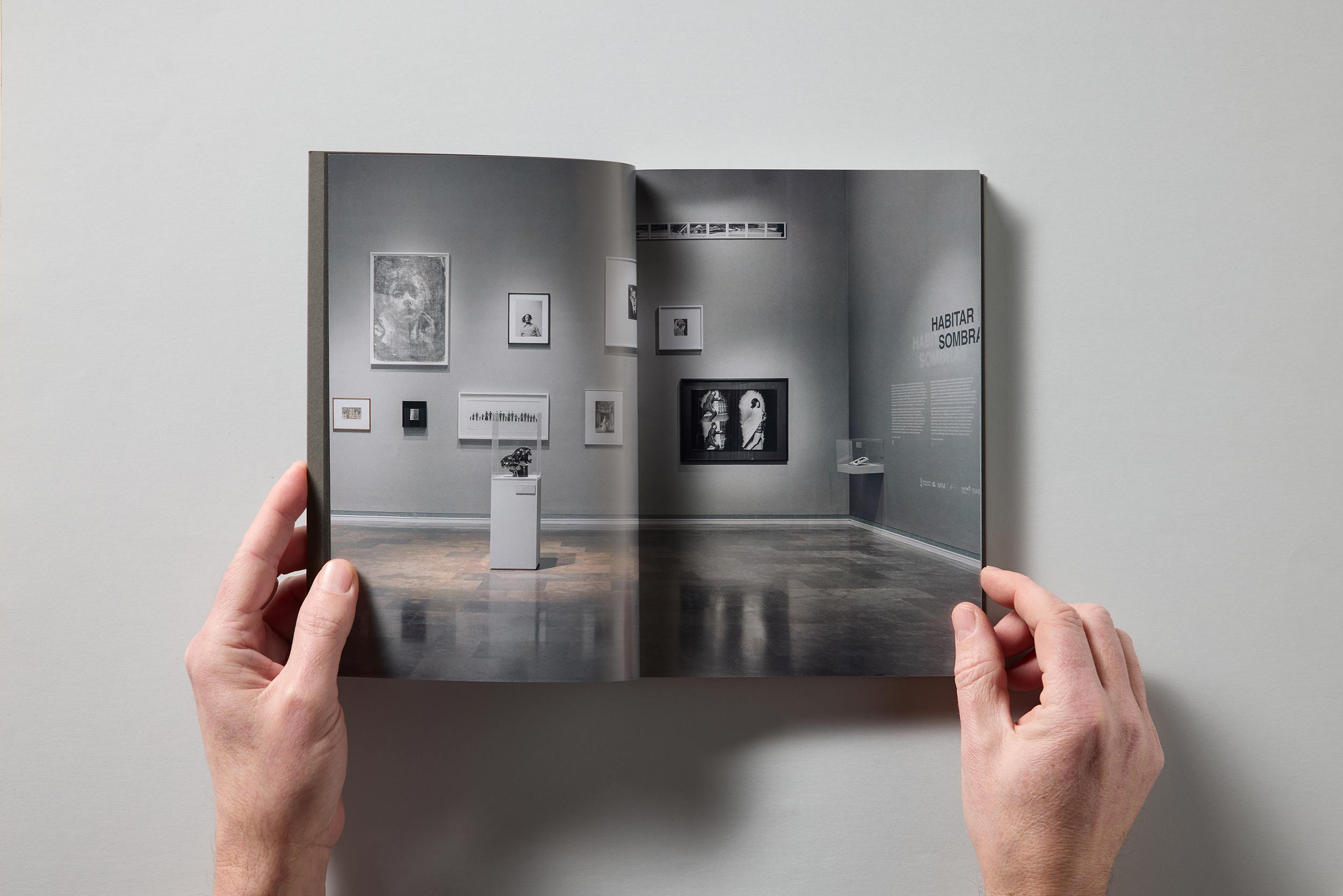 La publicación acompaña la exposición Habitar las sombras, distribuida en cuatro ámbitos expositivos que progresivamente oscurecen el tono de las paredes y la iluminación. El encargo pide explícitamente reflejar esa transición espacial, proponiendo la edición como una suerte de visita impresa al recorrido por las salas, con especial atención a la legibilidad y a la experiencia lectora.