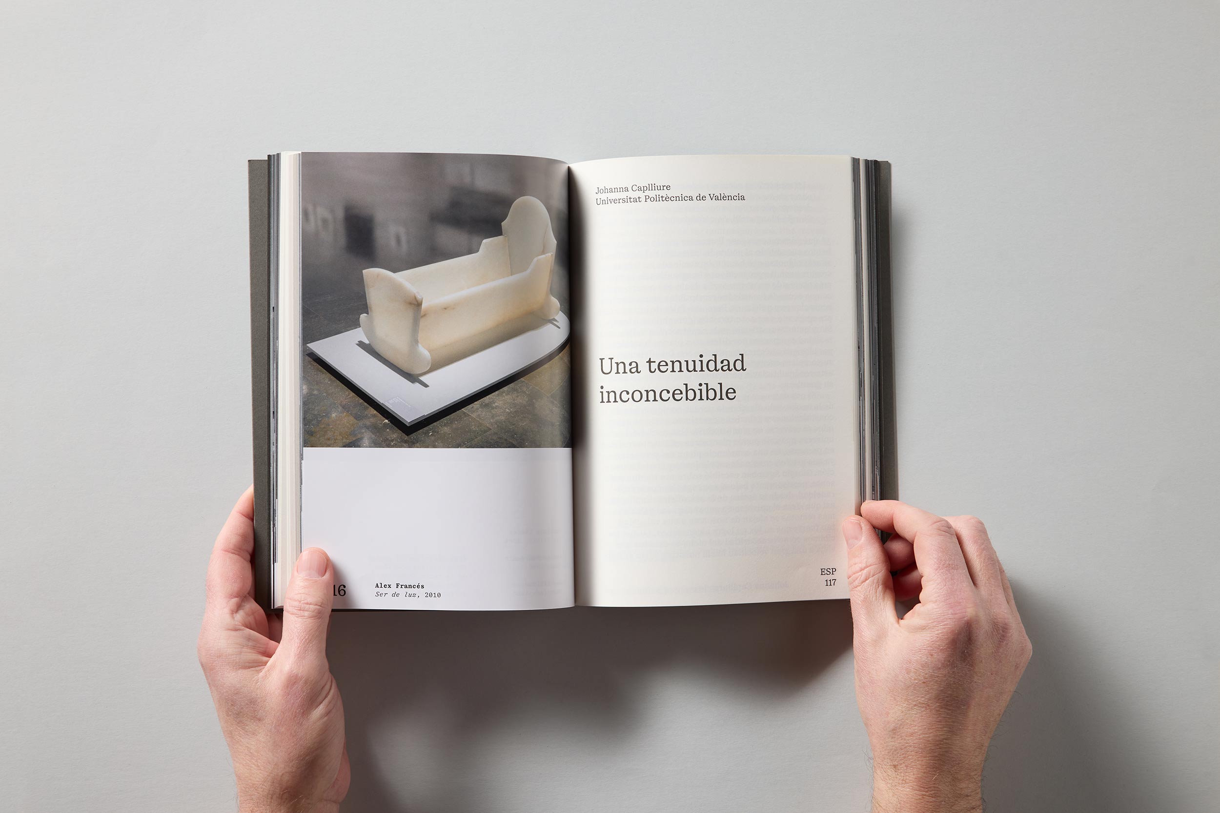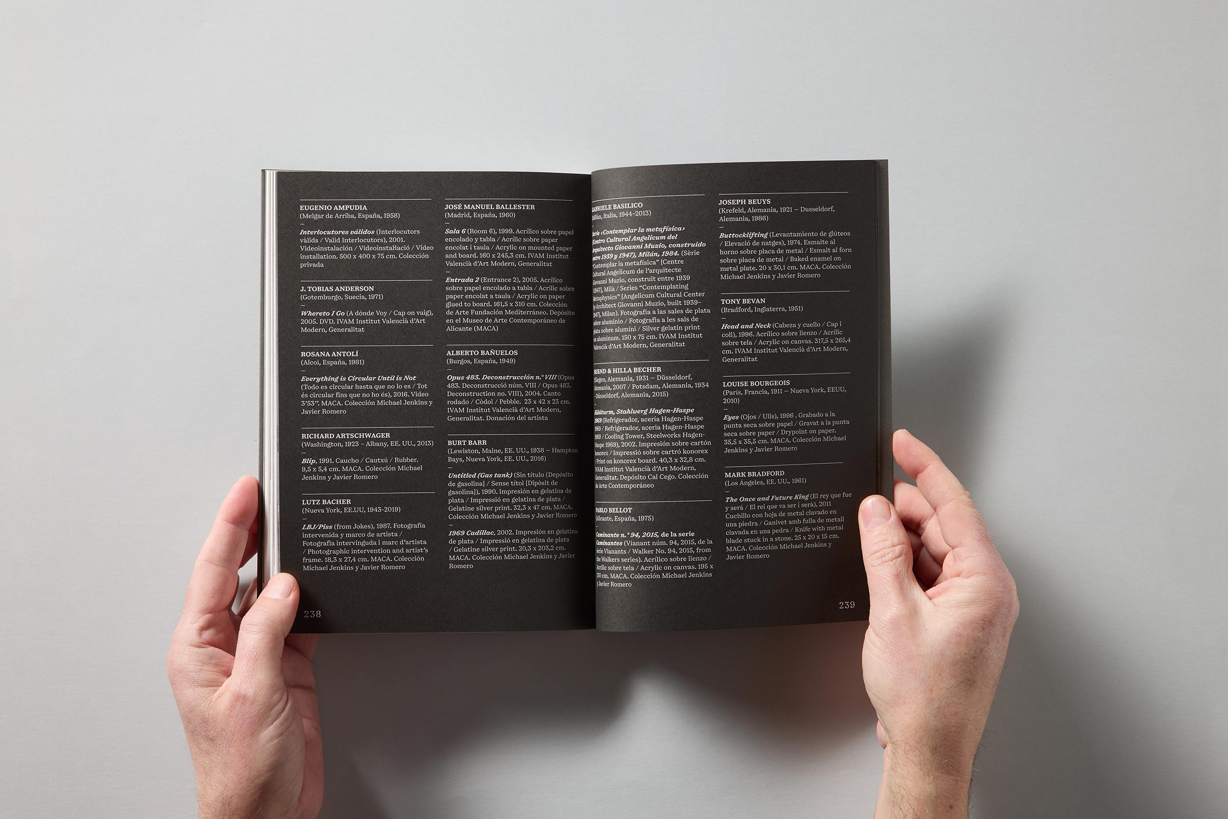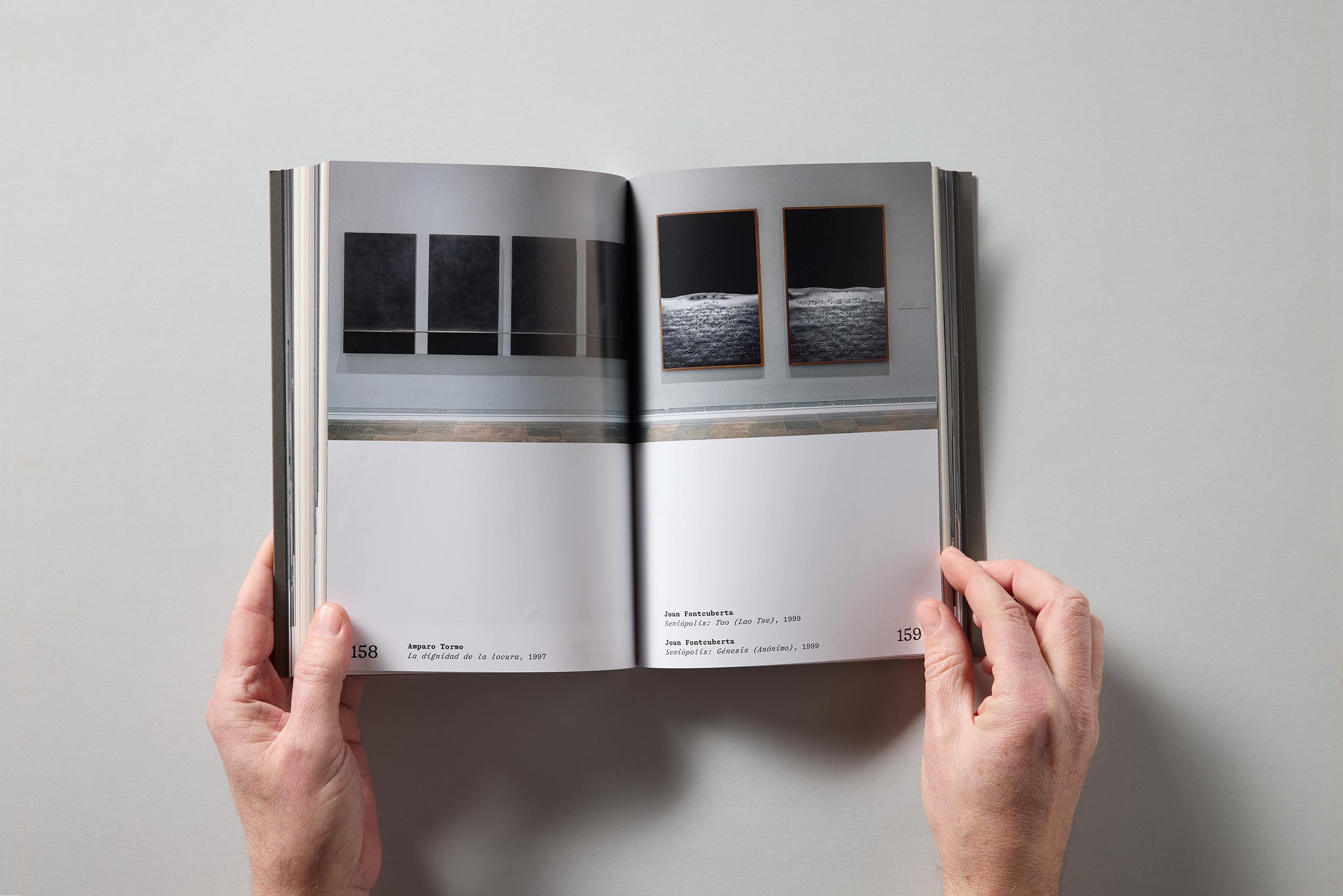 La edición, trilingüe, sitúa tres bloques de texto como “muros” que separan los cuatro ámbitos de la muestra. Las obras se fotografían in situ, reflejando fielmente el montaje y la secuencia del recorrido, lo que permite al lector establecer relaciones visuales y discursivas entre las piezas, tal y como se plantean en el espacio expositivo.