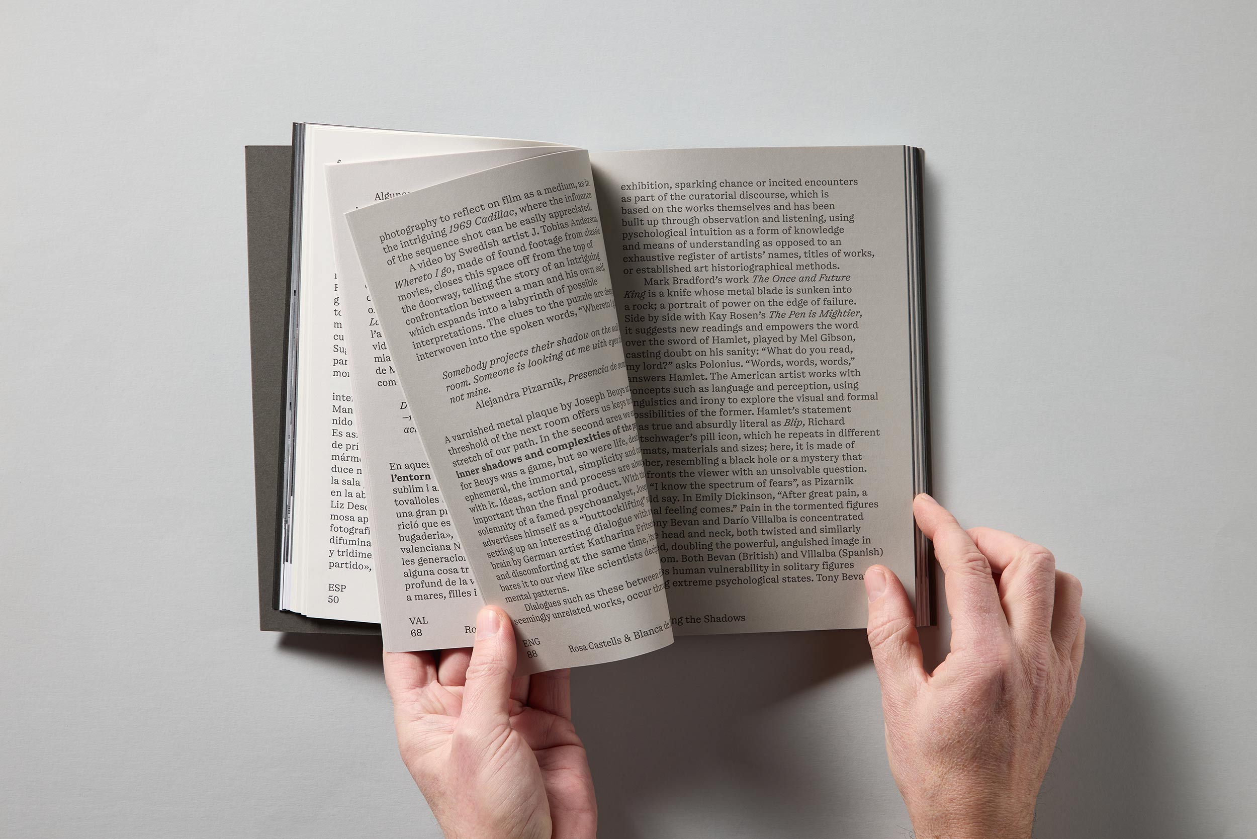 El formato, cómodo y flexible en la mano, está pensado para favorecer la lectura. El tono de los papeles se oscurece con cada cambio de idioma, acompañando visualmente la idea de tránsito entre luces y sombras.