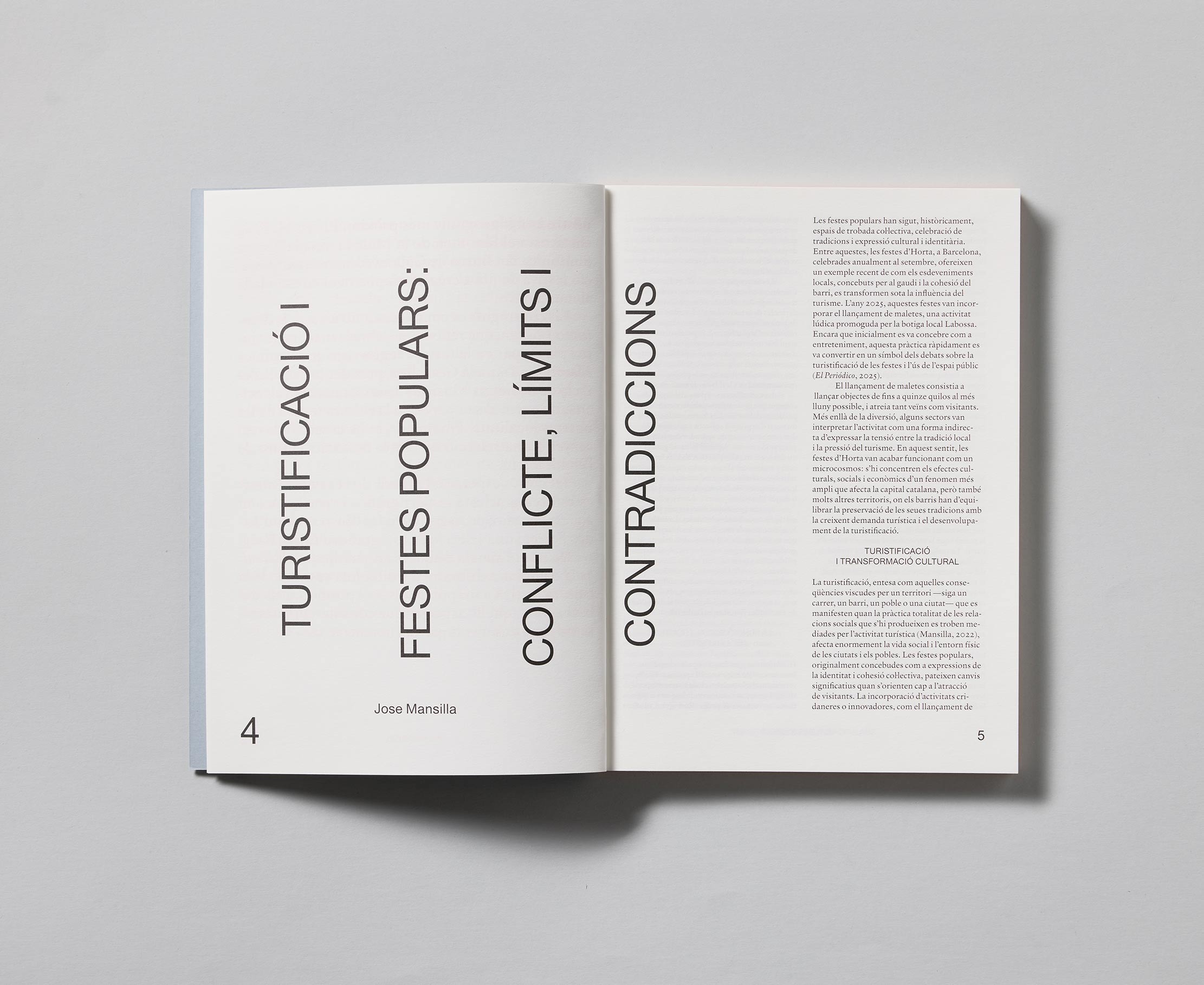 Desde el punto de vista material, se opta por una producción contenida, con cambios de papel según el tipo de contenido. La portada incorpora una lámina adherida sobre huella en seco, que aporta una sutil dimensión táctil al objeto. El formato, cómodo y flexible en la mano, refuerza la vocación de lectura.