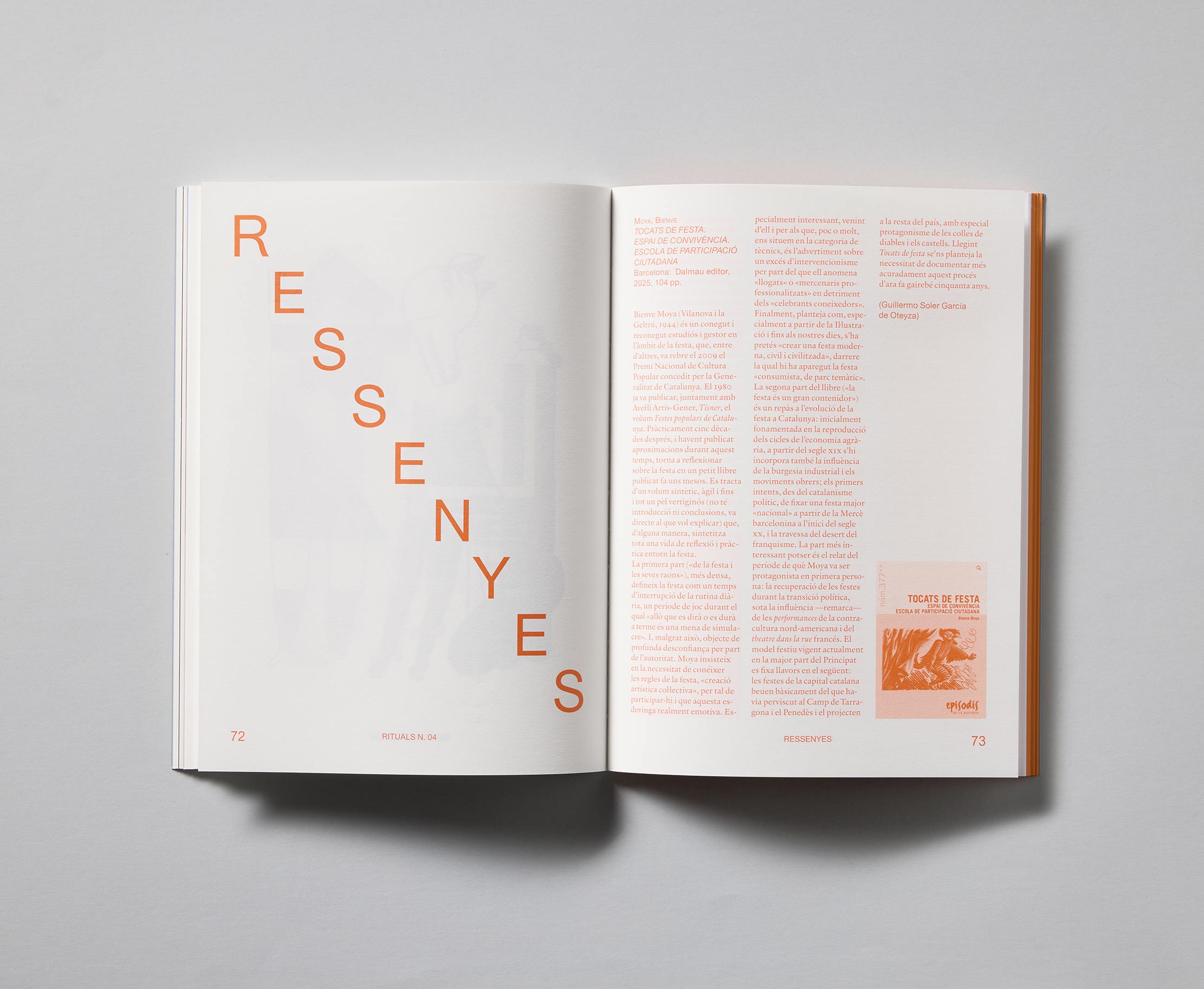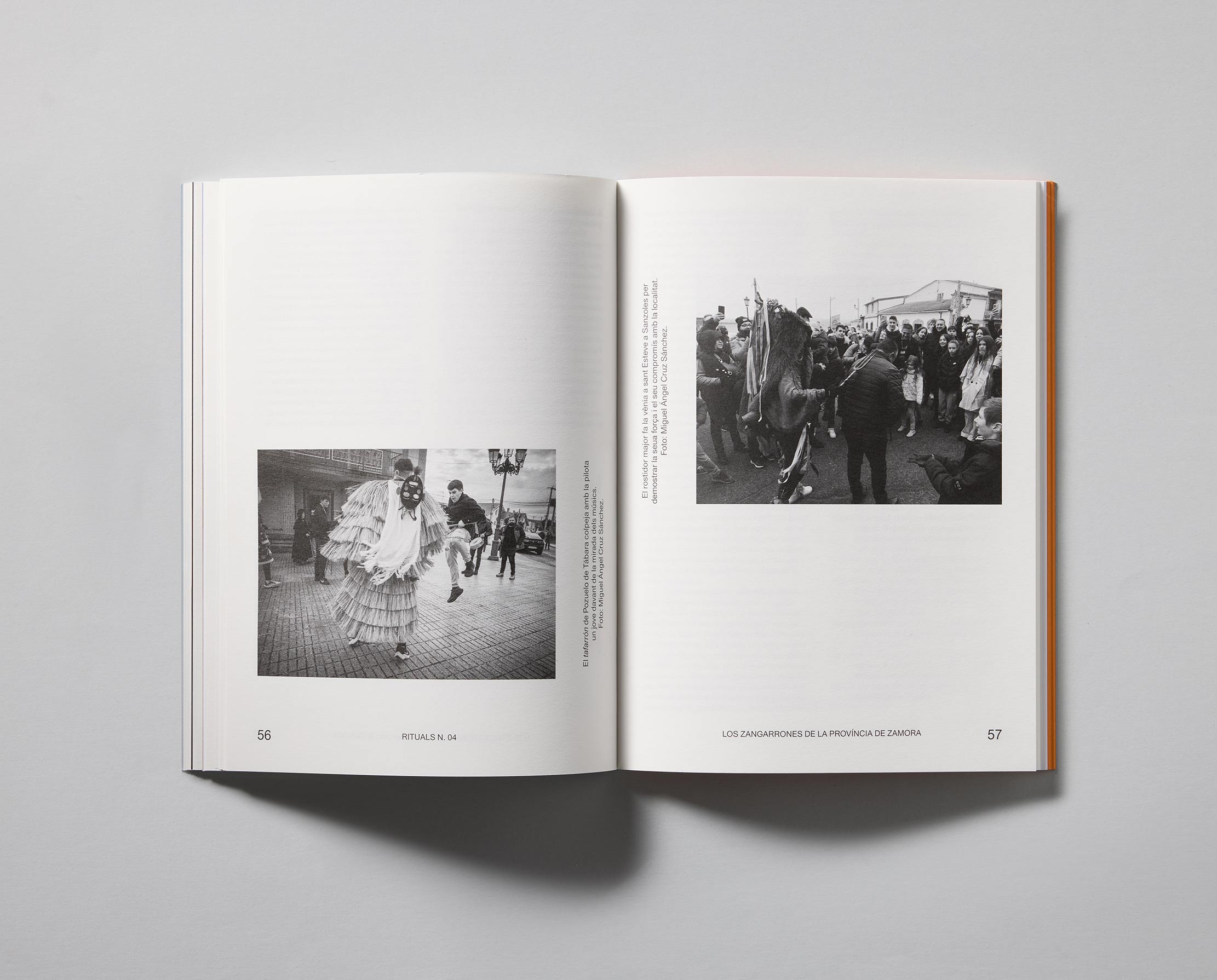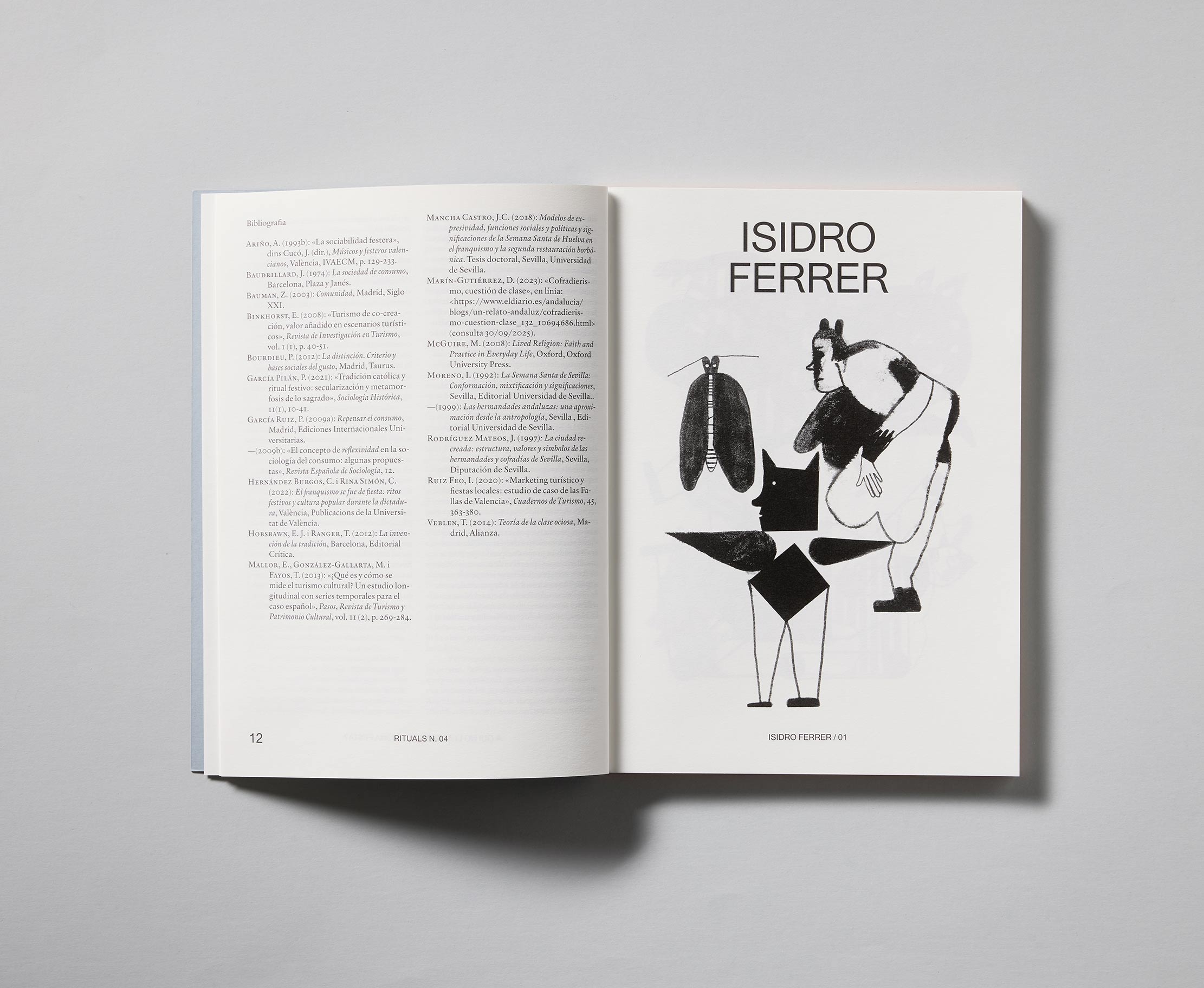 El diseño editorial apuesta por un estilo sobrio que favorece la experiencia lectora y se centra en los contenidos. Esa sobriedad contrasta deliberadamente con el tono expresivo de las ilustraciones y con ciertos gestos de diseño —como en el índice, donde se superponen texto e imagen— que introducen tensión visual y actúan como una declaración de intenciones. Las ilustraciones se tratan como contenido autónomo, no como mero acompañamiento de los textos, y se integran en el discurso desde una lógica editorial cuidada, apostando por una mirada más radical, crítica y contemporánea sobre las manifestaciones festivas populares.